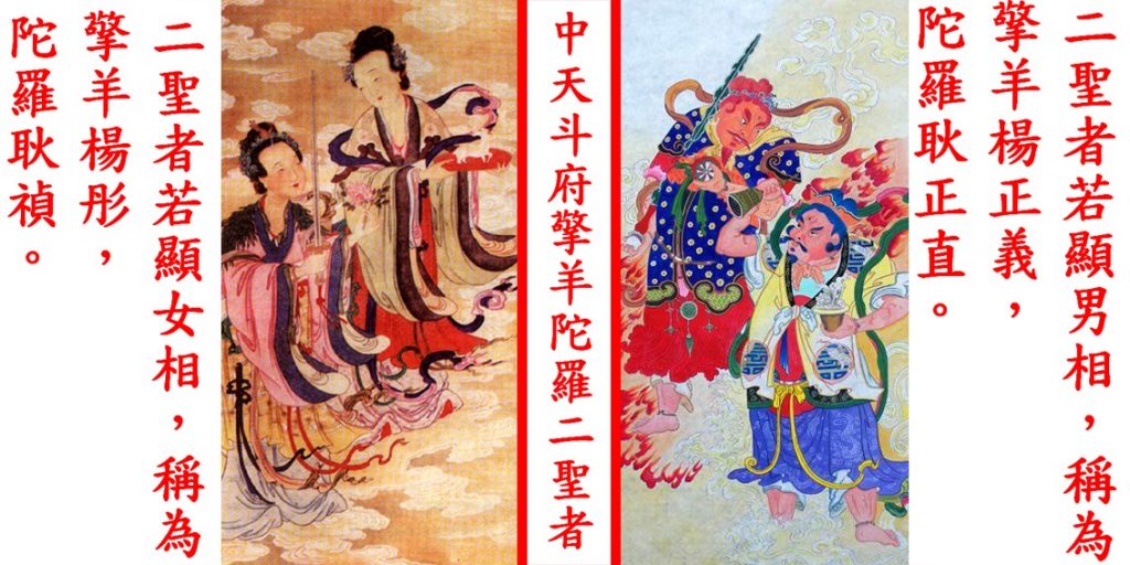 【二聖者】若顯「男相」時﹐稱為【玉梵擎羊楊正義】及【玅梵陀羅耿正直】。【二聖者】若顯「女相」時﹐稱為【擎羊楊彤】及【陀羅耿禎】。