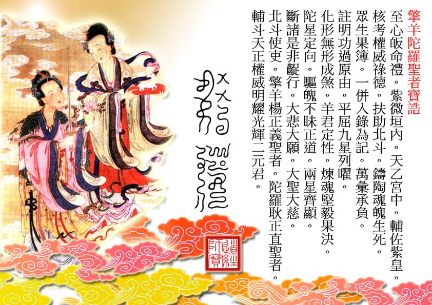 但如果【擎羊陀羅二聖者】是顯「男相」時﹐則被認為是【斗姆元君】的雙位【護法】暨【斗父天尊】駕前兩位【使者】。