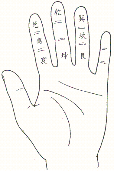 如在第二、三四指的九個關節紋上,以三指-中指中紋為九宮中文,餘八個關節紋為八卦文(依據後天八卦位從四指根部關節紋為乾文起始);